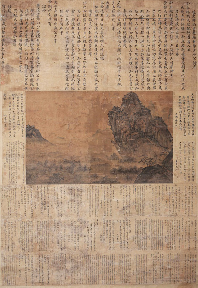 《泰山图》是明嘉靖朝吏部尚书、文渊阁大学士石珤在1522年即明朝世宗朱厚熜嘉靖元年遣祀阙里(孔子故里)及东岳少昊陵回朝后,朝中同官颂其功德而辑成。资政大夫实录副总裁、前翰林学士毛澄的真楷题序;阁臣杨廷和、毛纪、蒋冕和费宏行书题诗;画外下部是36位知名官员的真行隶草诗赋,被央视和文物部门认为“极一时之盛”、“价值连城”。 同时推出的是石珤家族家传的两道明嘉靖七彩一品圣旨。