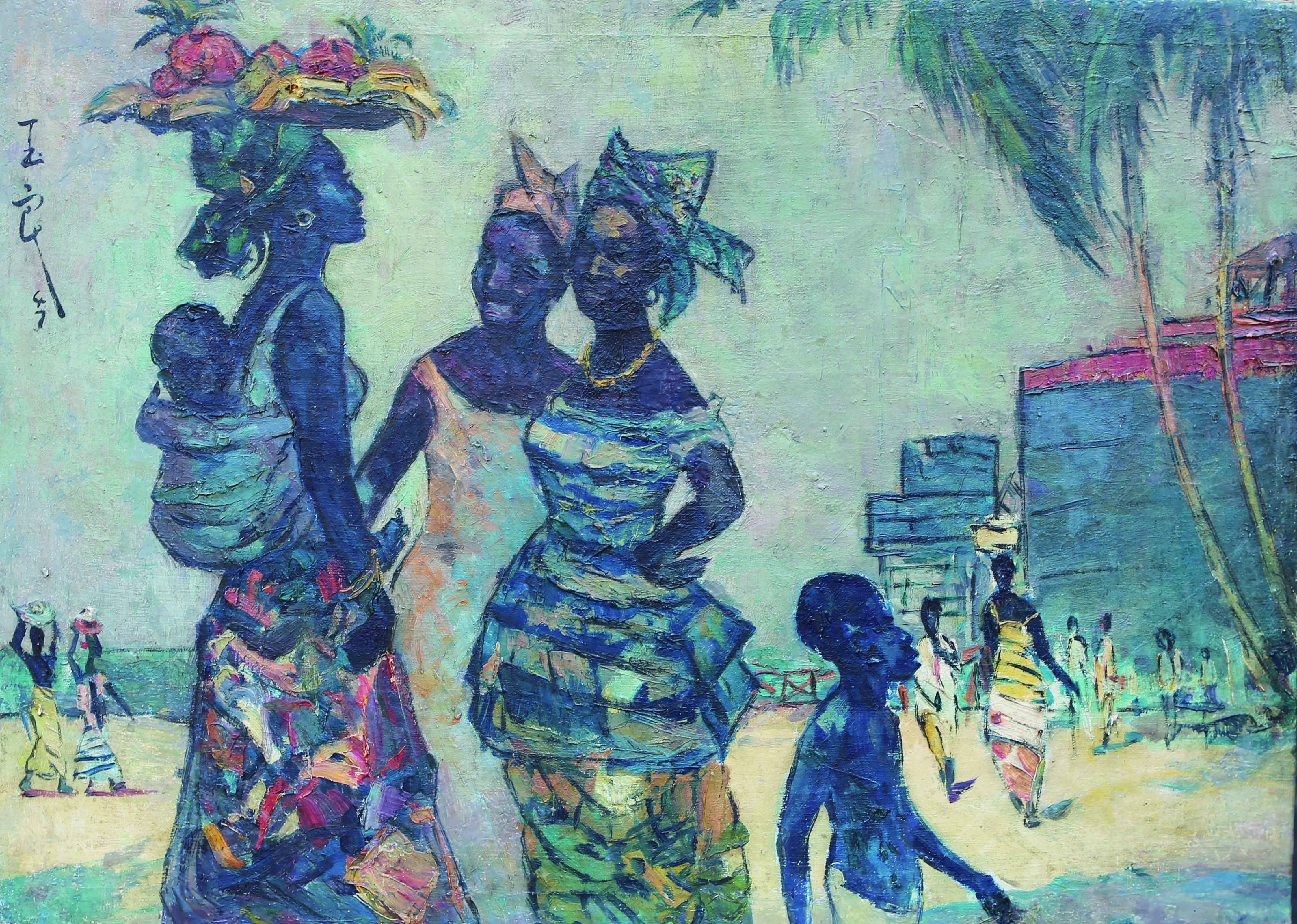 潘玉良1947年创作的这幅非洲风情人物,画面充溢着非洲热带的风情,海水在哗动、椰子树叶在摇曳,聊天中的两位非洲女子身材丰硕,一位背着婴孩的年轻母亲丰乳细腰,如同美丽的黑珍珠。作品构图大胆而夸张,画面奔放而深沉,色彩绚丽而宁静,有着强烈的动感,给人以美的享受,呈现出特有的审美情趣。